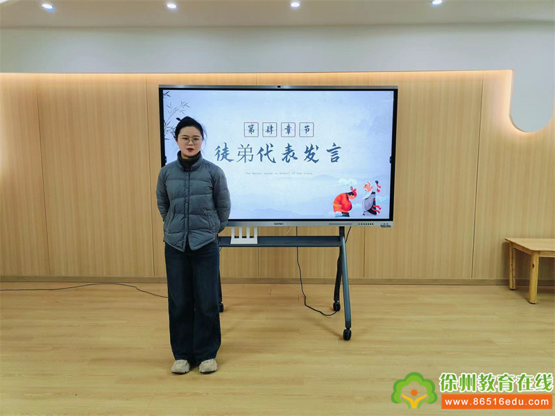 徒弟代表闫蕾蕾老师:很荣幸作为徒弟代表来发言,也感谢园里为我们提供这次师徒结对的机会。进入中心幼儿园四年多的时间,我深深地感受到了这个和谐大家庭的温暖,来幼儿园的第一年就很有幸拜了第一个师父,是我们的沈老师给了我很多的帮助,这四年有很多的经历,也有过迷茫的时候,这四年在邻班的前辈老师们的帮助中成长了很多,只是在教学的过程中,个人的思想总是不够开阔,对自己的评价也不是那么的客观,所以我们需要有一个更有经验的人来做我们的领路人。