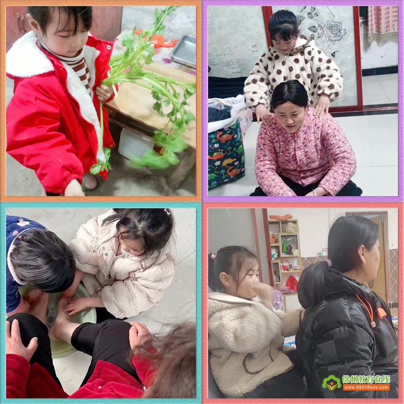 爱不仅仅要说出来,更要大胆地表现出来, 你们瞧,孩子们在家里帮助大人收碗筷、洗碗、擦桌子,给妈妈,奶奶或姥姥梳头、洗脚、端水、按摩、捶背.....小小的身影在做一件件力所能及的事情,而小小的行动,更是在孩子们的心灵洒下了爱的种子,让他们学会了感恩和关爱,懂得了孝顺和珍惜。