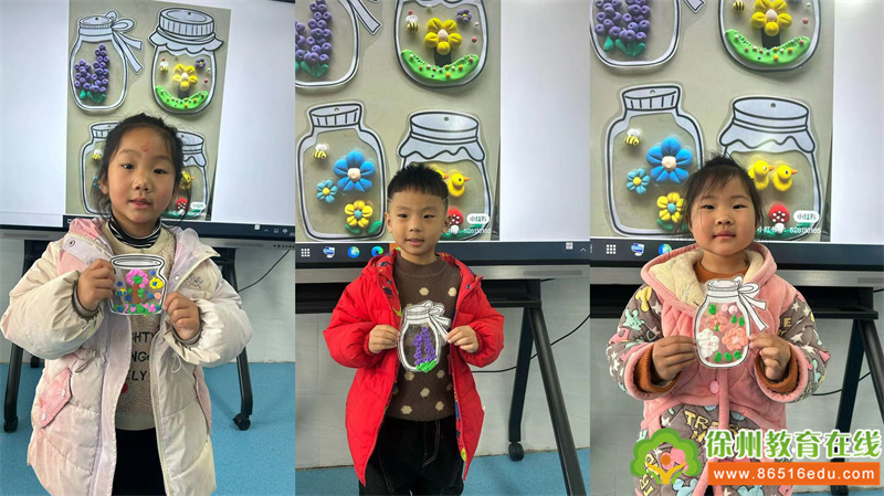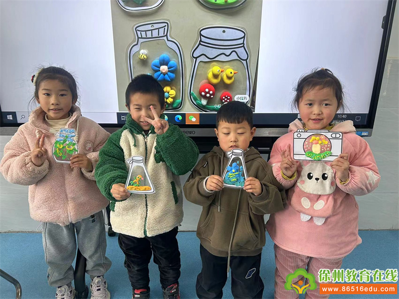 “我想把春天做成一棵开满花的桃树”,一位小朋友说,“我想把春天做成向日葵”,“我想……”孩子们迫不及待的想要将春天变成自己喜欢的作品,嫩绿的枝条、粉红的桃花、绿绿的小草、七色的彩虹……孩子们稚嫩的小手运用剪、捏、粘等方式,不一会儿,将太空泥制作成了一幅幅美丽的春天画面。