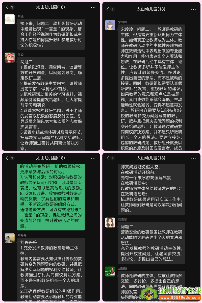问题二:幼儿园教研活动中经常出现一言堂的现象,结合工作经验说说作为教研组长或主持人,你是如何提升教师参与教研讨论的积极性?