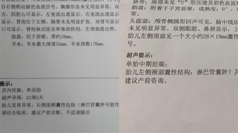 产检超声提示胎儿淋巴管囊肿(旧称)