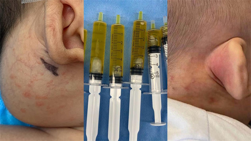 【关于硬化治疗】用细针穿刺淋巴管畸形囊腔,抽取淋巴管畸形囊腔内淋巴液,在注入硬化剂,注入硬化剂的目的是破坏淋巴管畸形囊壁细胞,最后淋巴管畸形囊腔萎缩闭合纤维化后被机体吸收。