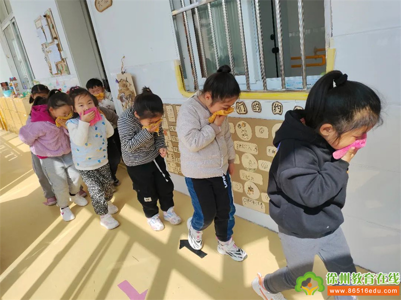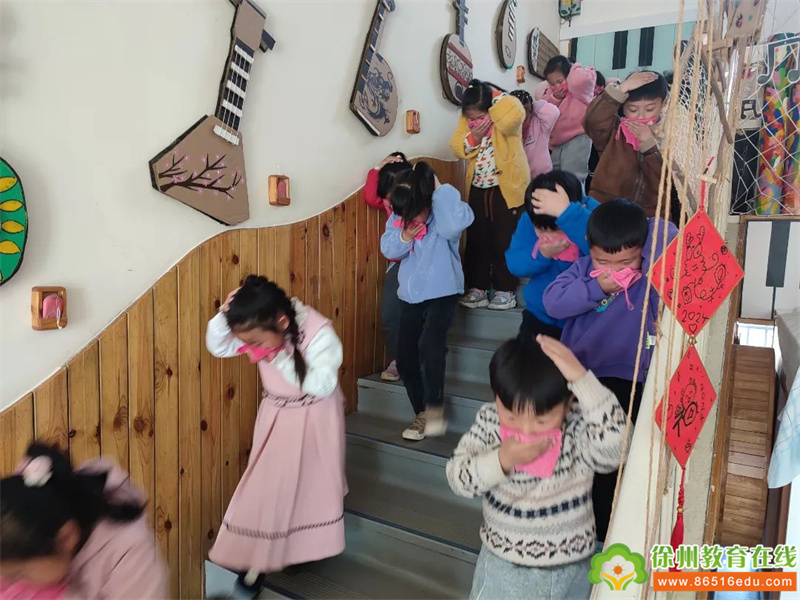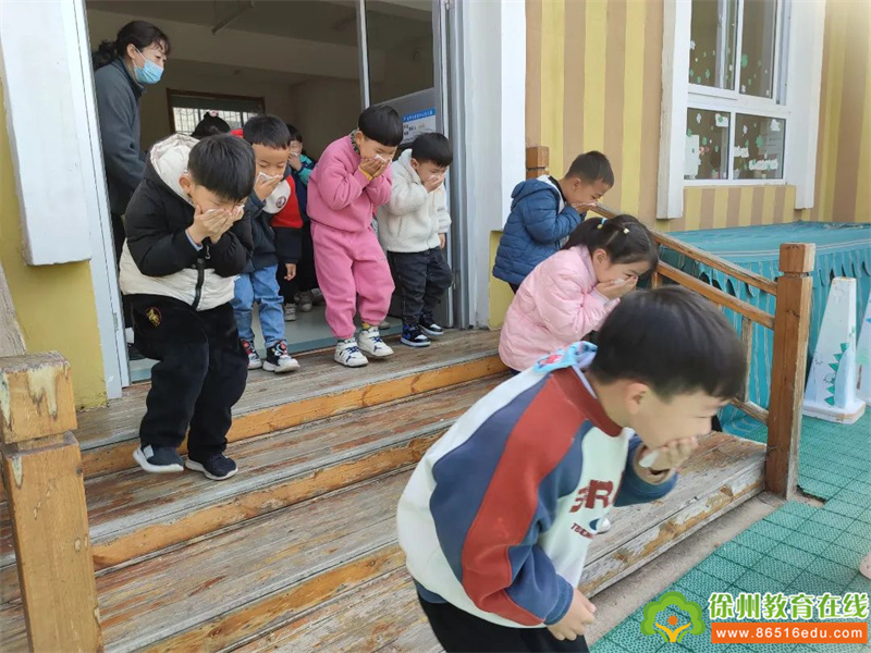 十点整,随着急促的警报声响起,各班教师迅速作出反应,组织幼儿拿起湿毛巾,捂住口鼻、弯腰俯身,按照疏散路线有序地向安全地带撤离。