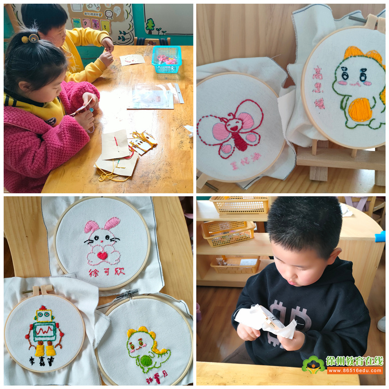 一双双小巧手,一根根绣花针,引着五颜六色的线,在绣布上四处游走。大二班的教师基于幼儿的兴趣,和孩子们一起探索关于刺绣的奥秘。在绣制绣品的过程中,刚开始穿针和打结困难,经过多次的研究与练习,孩子们的“刺绣手法”逐渐熟练。随着刺绣活动的推进,发现不仅幼儿的专注力好、持久力、坚韧性等良好学习品质都得到了提高,幼儿对于非遗刺绣产生了浓厚的兴趣,感受到刺绣工艺的魅力和民间艺术的美。