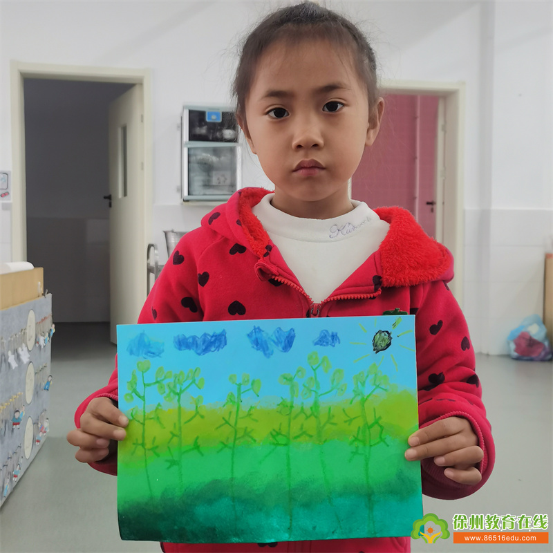 于是起床后,便请幼儿与大家分享中午散步时看到的油菜花,孩子们便你一言我一语的讲了起来。有的说:“油菜花的叶子是锯齿状。”有的说:“油菜花由四个花瓣,都是小小的。”还有的说:“油菜花是黄色的,远远看上去是一片一片的。”在幼儿交流完后,纷纷决定用手中的蜡笔将中午看到的油菜花画下来。