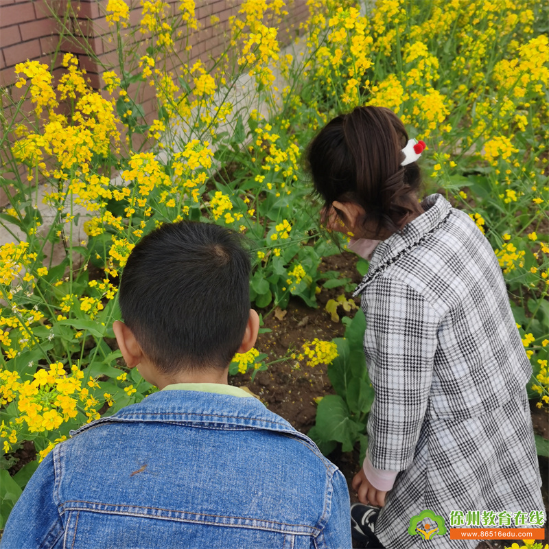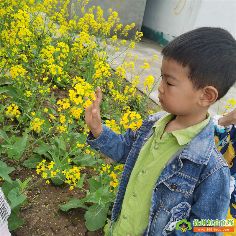 一路上,孩子们呼吸着清新的空气,走着、看着,他们发现冬天光秃秃的树枝上突进披上了绿色的外套,经过长眠的小草终于也醒过来了。我们来到了种植园地,远远望去,一朵朵油菜花聚集在一起,金灿灿的,组成了一片小花海。孩子们好兴奋,都跑过去欣赏。