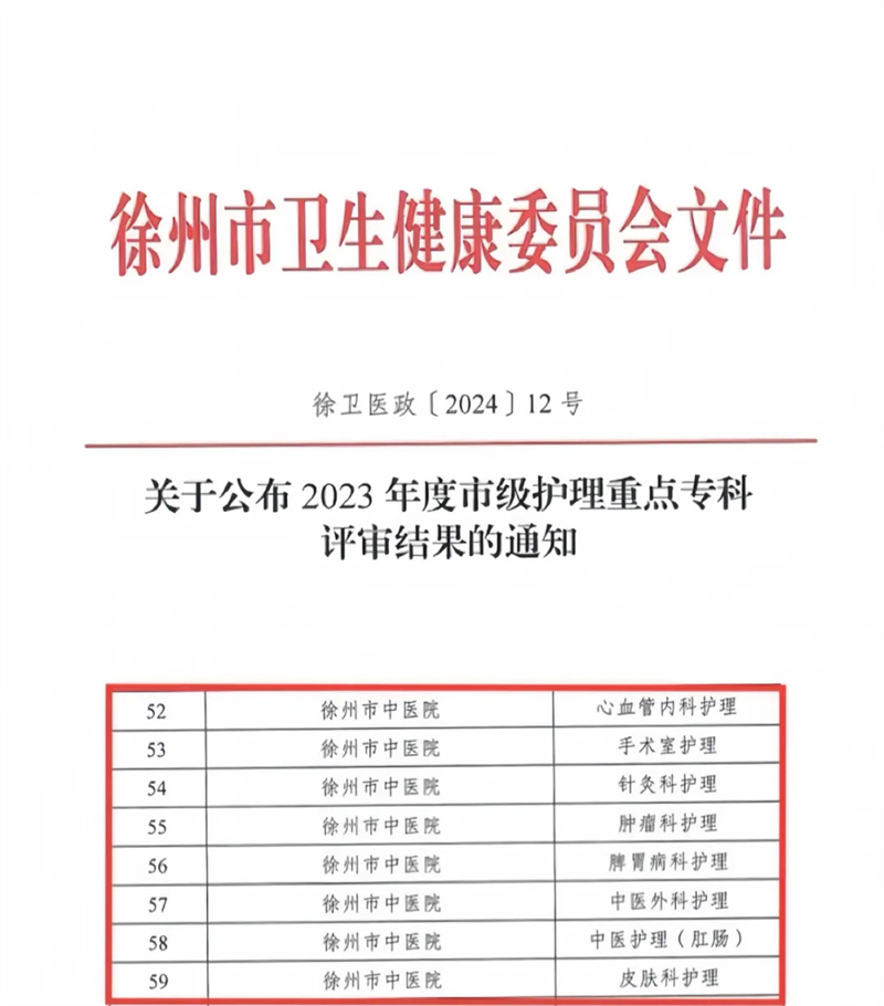 近日,徐州市卫生健康委员会公布了2023年度徐州市市级护理重点专科评审结果,徐州市中医院心血管内科护理、手术室护理、针灸科护理、肿瘤科护理、脾胃病科护理、中医外科护理、中医肛肠科护理、皮肤科护理共8个专科获批市级护理重点专科。这一荣誉的获得,不仅彰显了徐州市中医院在护理领域的专业水准,也为全市中医护理事业的持续发展注入了新的活力。