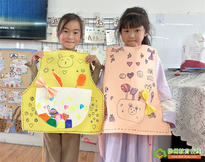 孩子们形式多样,画面中运用了勾线笔、蜡笔、剪贴的创意绘画形式将厨房里的厨具等都体现在了围裙中,让画面更加具有趣味性。孩子们边创作,边感受妈妈的辛勤劳动,增强了孩子们增强了孩子爱妈妈的情感。