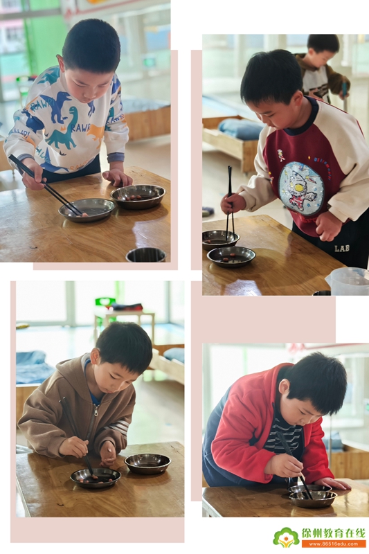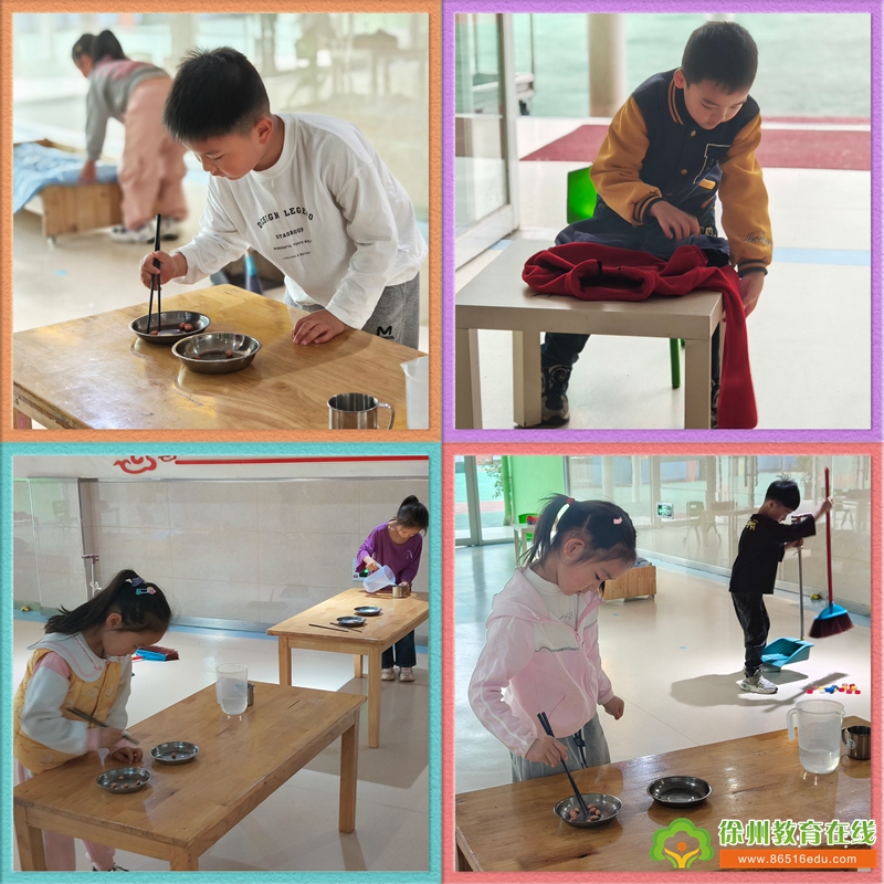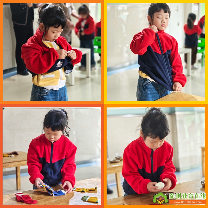 大班的哥哥姐姐,经过了小班和中班的学习,经验丰富多了,他们镇定自若,手法娴熟,快速地叠被子、叠衣服、扫地、用筷子夹花生、整理书包,一个比一个能干!