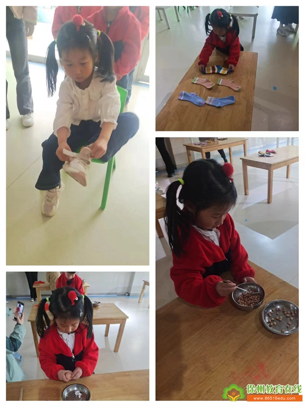 中班小朋友们一个个都精神饱满,信心十足,整个赛场充满紧张的氛围。宝贝们将穿鞋子、穿衣服,然后在桌子上剥起了花生,再迅速将整理水彩笔、书本,动作快速、干练,都是棒棒哒!