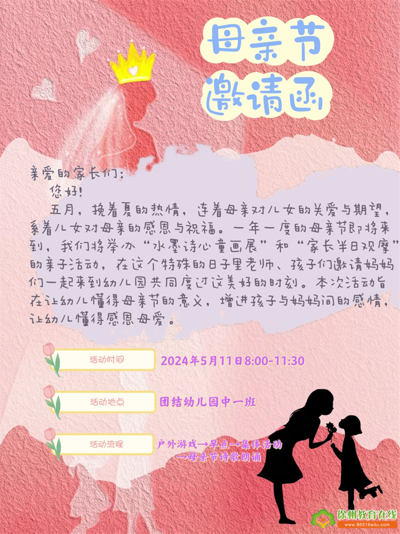 初夏的花儿自开自落,蓝蓝的天空云卷云舒,植物有了按捺不住的生命力,风的气味变甜了,天空的色调变暖了,当五月的花香飘满我们心尖,“母亲节”也如期而至。为引导幼儿体验浓浓的亲子情,萌发爱的情感,感悟成长过程中妈妈付出的艰辛和不易,学会感恩,体贴关爱妈妈。在母亲节即将到来之际,贾汪区团结幼儿园中班组开展了《以爱为名,感恩有您》母亲节主题活动暨家长半日观摩活动。