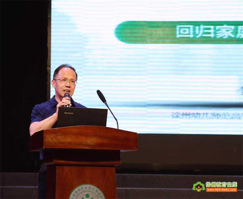 江苏省学前教育学会家庭教育专委会主任、徐州幼专科研处处长李飞做了题为《回归家庭教育的原点》专题讲座,他从家庭教育的关键、家庭教育的核心、家庭教育的内容、家庭教育的方法等四个方面引导家长要重新澄清家庭教育的本来面目,以身作则、言传身教,一言一行都要为孩子做出榜样。
