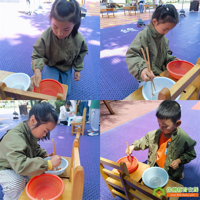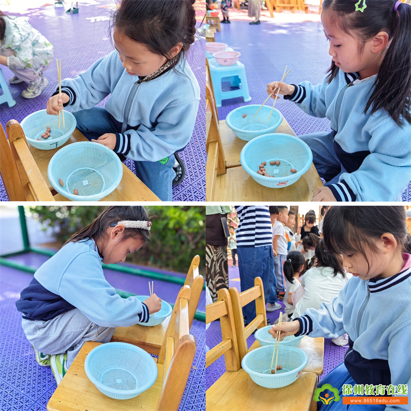 随着主持人的一声"开始",孩子们个个精神抖擞,信心满满,全力以赴,拿出了超常的本领,他们纷纷以最快的速度将花生夹进筐子里。