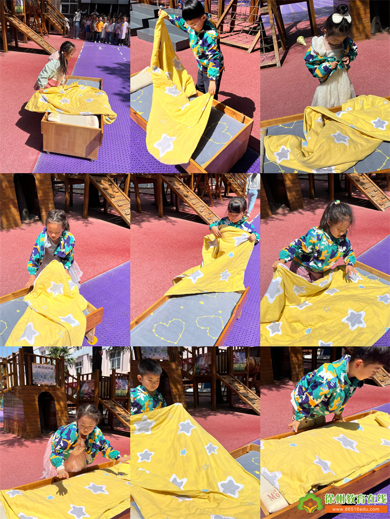 只见他们的小手不停地抖动被子,熟练地平铺被子,在被子上迅速的移动,展开、铺平,对折……小选手们争分夺秒,很快被子都已经整整齐齐地呈现在大家的眼前啦!