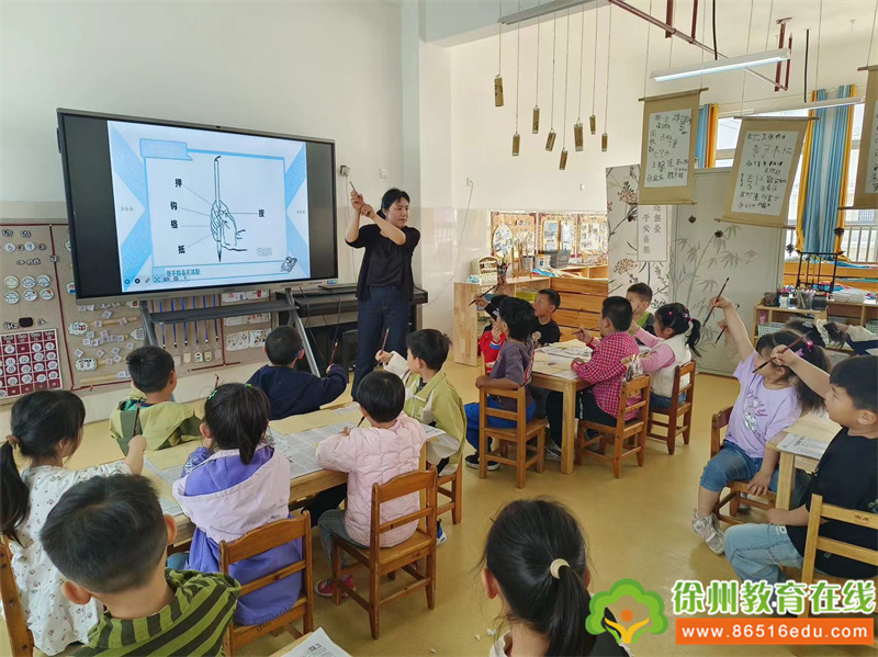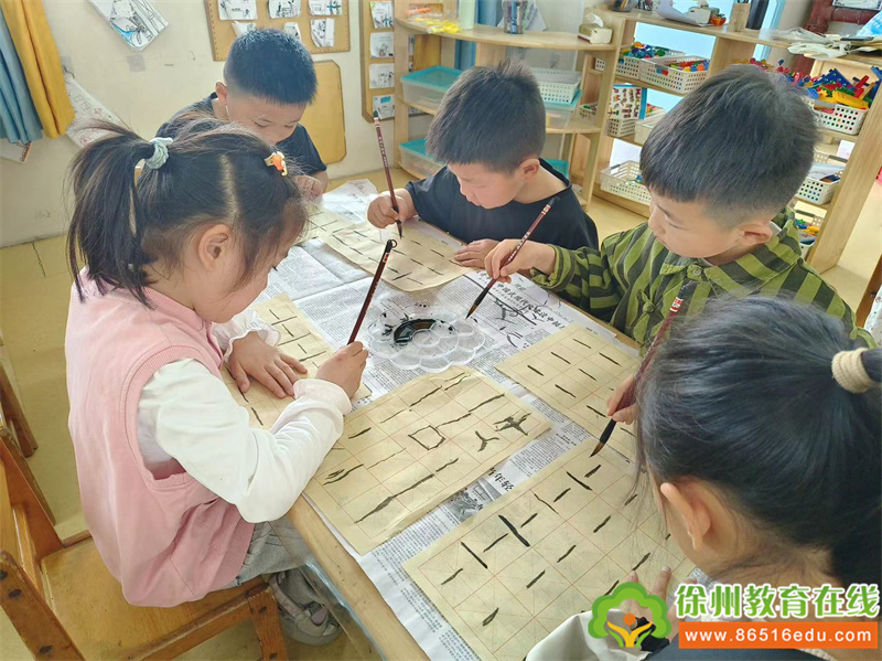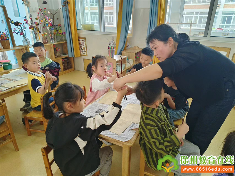 赵老师讲课生动、态度温和,她从书写姿势、握笔的基本功开始入手,加入了螺旋线的线条游戏,再到横竖的笔画练习,最后进入字的书写练习。这样的过程设计很符合幼儿的年龄特点。幼儿在横竖的笔画中感受书法带来的快乐,同时明白了正确书写姿势的重要性。讲解过后,孩子们尝试自己写,赵老师给予指导,看他们写的多认真!
