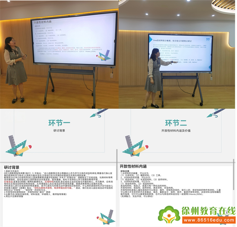 接下来马园长从此次教研背景、开放性材料内涵及价值向老师们进行讲解。材料是幼儿进行区域游戏的物质基础,孩子们是在与积极互动中建构知识体系的。什么样的游戏材料才会引起幼儿的探索兴趣呢?《纲要》指出:“材料应具有开放性,有多种组合的可能。”因此,在幼儿园区域活动中投放的材料应以“开放性”、“探究性”的材料为主。开放性材料是儿童在游戏时可以移动、操作、控制和改变的,吸引人的、很好找到的物件和材料,能满足幼儿的游戏欲望,能激发幼儿用自己的方式自由操作、改变、组合的提升自主游戏行为。