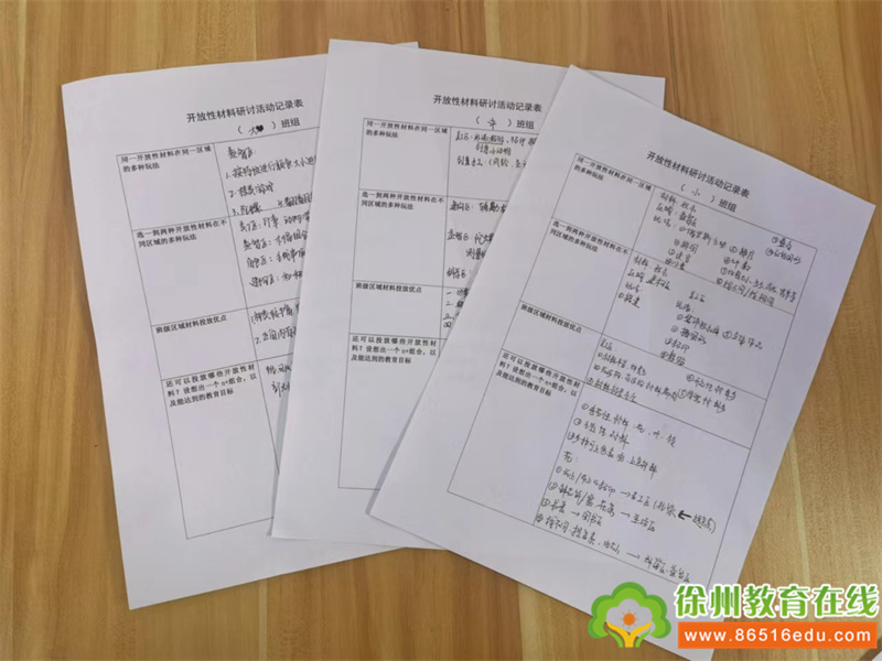 最后通过研讨实操活动、交流研讨活动深入开展本次教研活动,教师通过“同一开放性材料在同一区域的多种玩法”“一到两种开放性材料在不同区域的多种玩法”的教研内容开展年级组研讨。最后结合班级区域材料投放现状,找到班级材料投放的优点及不足,罗列缺少的开放性材料及材料的教育功能。