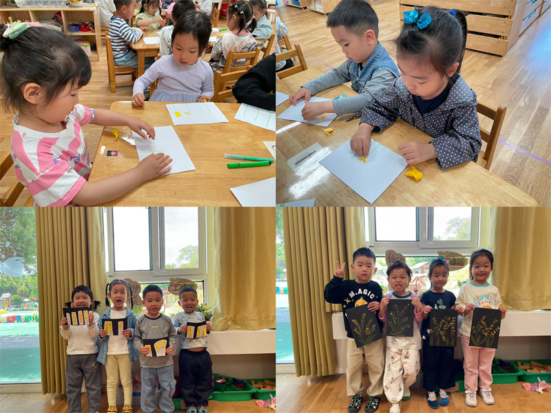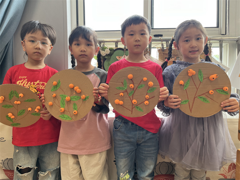 每个孩子心中都有一颗感受美的种子,孩子们通过观察并品尝枇杷,了解枇杷果实和枝叶的颜色、细节等形态特点,感受其独特的美感和外形特征。孩子们用水彩笔绘画枝干,卡纸拼贴树叶、彩泥揉戳果实,制作出立体的黏土枇杷。