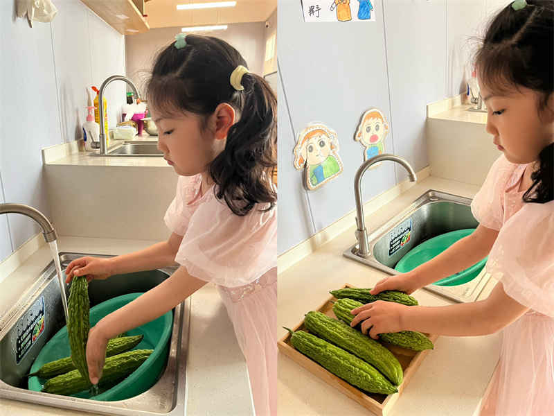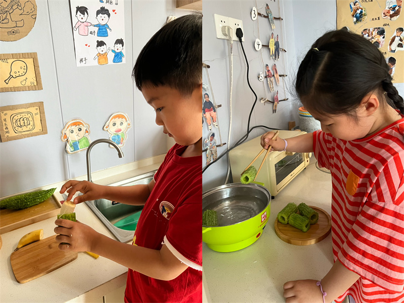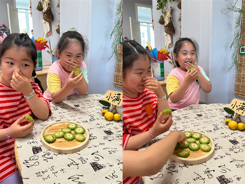 小满要食“苦”,体验小满的节气习俗吃苦瓜,孩子们参与体验制作蜂蜜苦瓜香蕉圈。孩子们先把带来的苦瓜清洗干净,接着切成小段,再用筷子把苦瓜中间的白瓤去除,然后放进开水里烫一烫去掉苦味。将煮熟的苦瓜放进冷水里冰镇一下,接着将香蕉放进苦瓜的空心里,再将苦瓜香蕉切成薄片装盘,最后淋上蜂蜜,香甜的蜂蜜苦瓜香蕉圈就完成啦!孩子们舔一口蜂蜜香蕉甜甜的,再吃一口苦瓜,变成了一个个表情包。其他孩子看到了不敢尝试,有的捏着鼻子,有的抿着嘴迟迟不敢尝试,真是一次有趣的吃“苦”体验。