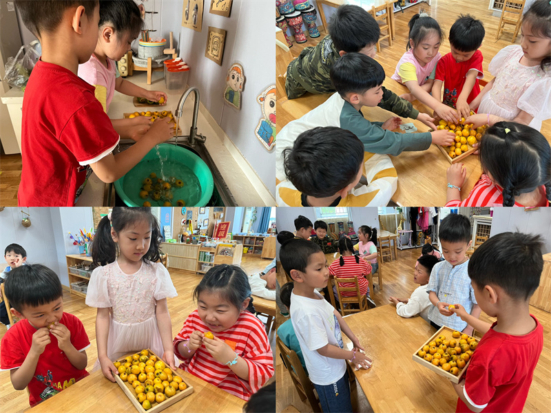 “小满枇杷半坡黄,栖棠飞雨满庭绿”,每个季节都有着独特的景色。五月的阳光在树梢间婉转舞动,金灿灿的枇杷挂满树枝。孩子们将采摘的枇杷带到教室分享,通过看一看、闻一闻、摸一摸、尝一尝多种感官,认识枇杷。黄灿灿的枇杷闻起来很清香,吃起来酸酸甜甜的,甚至没有熟透的枇杷吃起来酸酸的,孩子们感受着酸涩带来的奇妙体验,看着大家被酸到的奇怪表情开怀大笑。