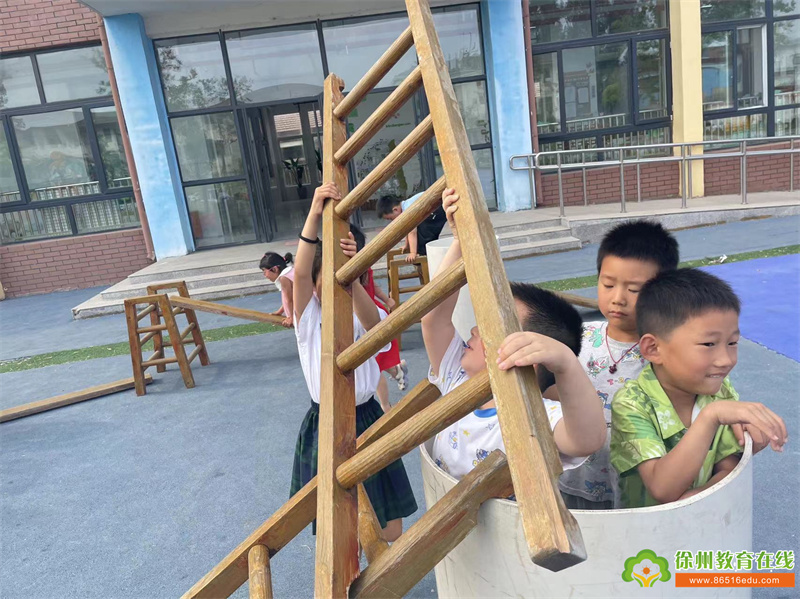 活动开始,孩子们搬来了直梯,井字梯,塑料桶,有的孩子尝试将梯子稳固地架设在竖立的滚筒上,然后发现出不来了。经过一系列的商量与讨论想到了以下办法:
