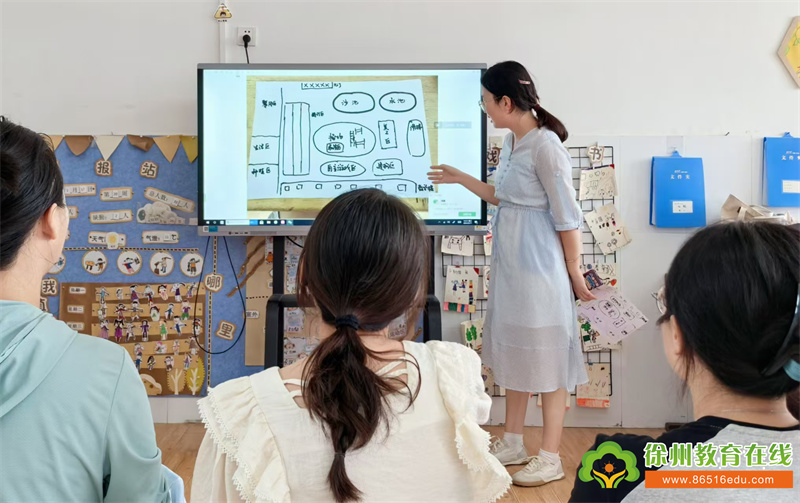 活动前,各班教师围绕幼儿园户外活动场地的合理使用进行了实地探讨,结合实际情况绘制户外场地规划图。郑园长抛出问题,让参研者共同回顾了幼儿园户外自主游戏场地规划的有关理论。各班教师代表从儿童视角出发,结合户外场地规划图进行分享,对各个场地的规划都提出了自己的想法,大致将幼儿园户外自主游戏场地划分为七个板块,分别是:种植养殖区、沙水区、骑行区、运动区、涂鸦区、表演区、生活区,后期会针对各区域所需投放相应的材料。