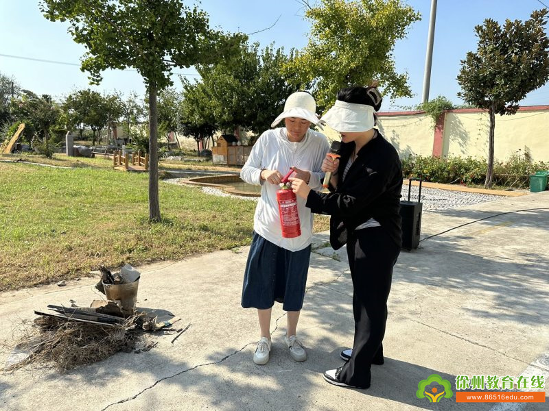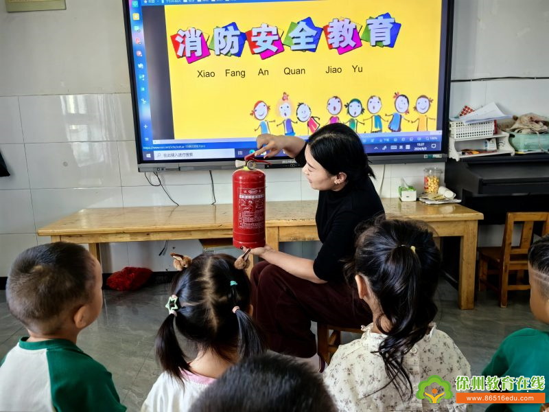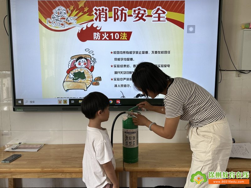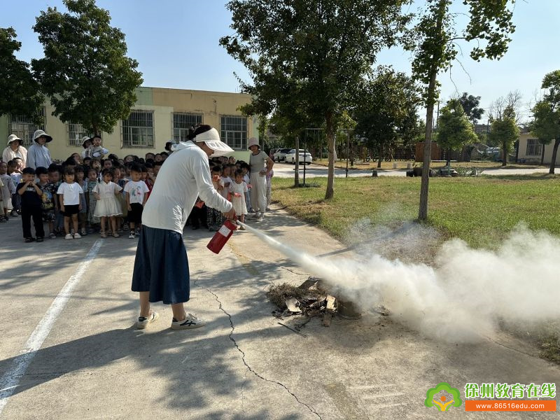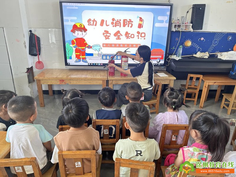 在幼儿园消防演练后,两位老师正在向孩子们讲解灭火器的使用方法。他们手持灭火器,详细示范操作步骤,确保孩子们能够正确使用灭火器,提高消防安全意识。