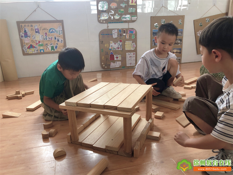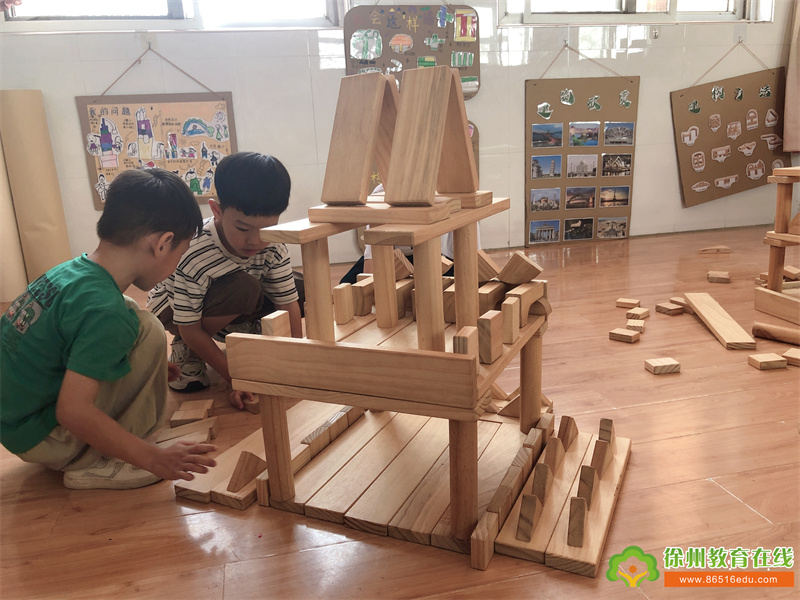 发现戏台可以使用Y型木来搭建二层戏台,可以看到幼儿不断地思考和调整,孩子们在经历了发现问题、探究问题和解决问题的过程中不断推进。通过和小伙伴们一起搭建戏台,幼儿们学会了合作,在各类游戏中锻炼了肢体平衡以及反应能力。