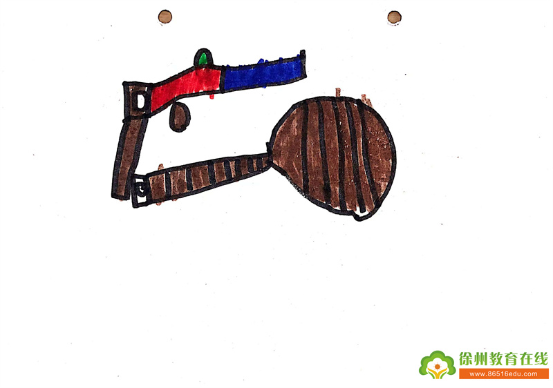 和孩子一起欣赏一段京剧表演!哈哈,我们看到伴奏的乐器啦!这些乐器叫做三大件。老师告诉我们,京剧的三大件分为文场三大件和武场三大件。文场三大件有京胡、月琴、弦子。武场三大件有单皮鼓、大锣、小锣。赶紧赶紧,我们赶快把这些乐器画下来。