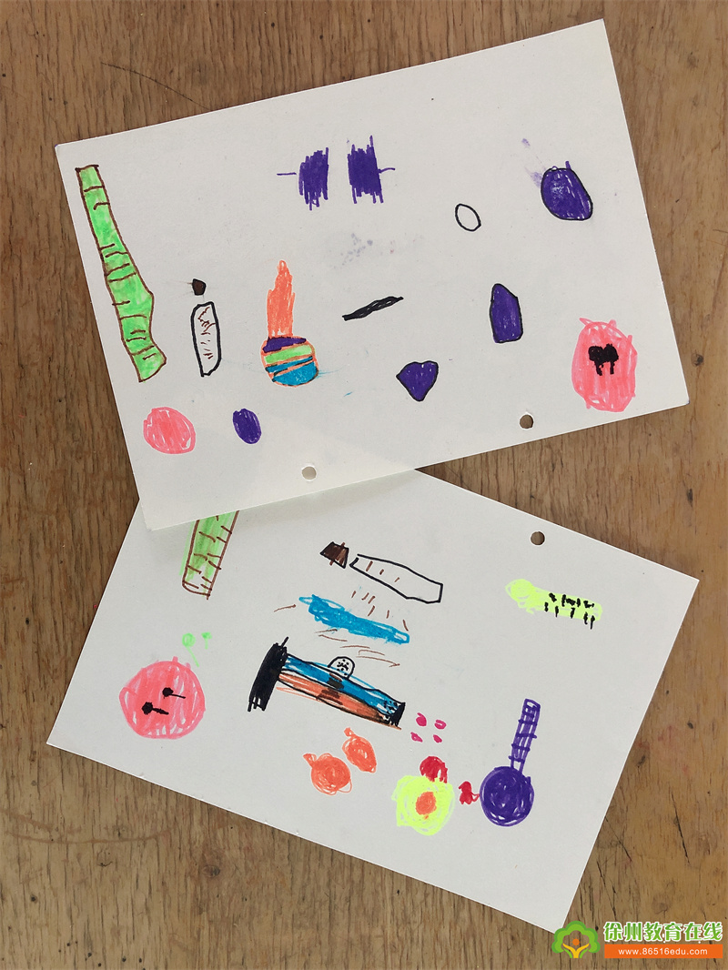 那唱京剧的时候都有哪些乐器来伴奏呢?于是乐器大猜想开始了,每个人都来画一画。有的说里面有锣,还有喇叭,可能还有双响筒,大家的答案五花八门,那到底是什么乐器支撑着我们的京剧表演呢?