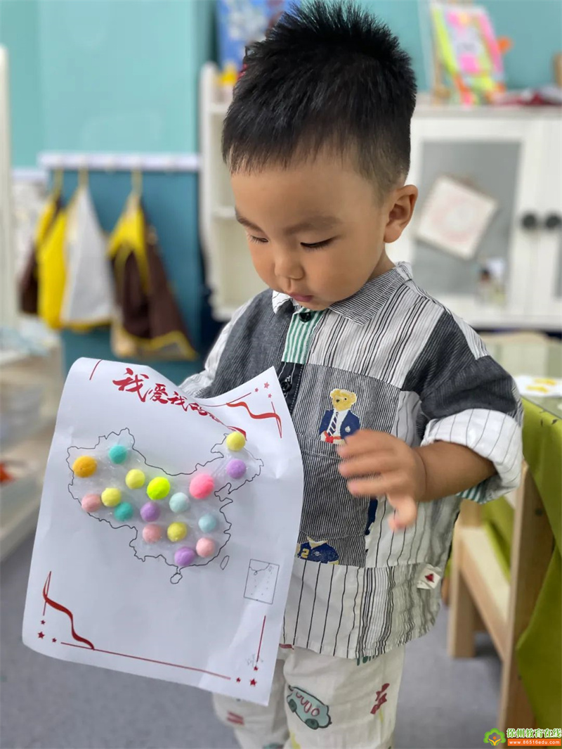 对于孩子们来说,他们最擅长的就是用小手涂一涂、贴一贴、画一画来表达自己的内心世界,孩子们用丰富的材料、独特的艺术语言,为祖国妈妈制作一幅幅独一无二的中国地图,犹如昂首挺胸的雄鸡,屹立在东方!