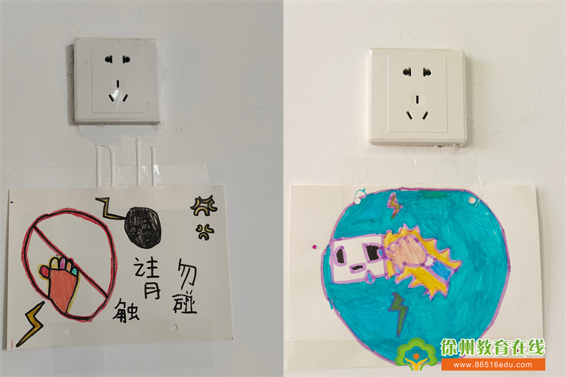 老师们还现场演示了如何正确使用电器设备,如插头要插紧、不能用湿手触摸电器等。同时,也告诉孩子们如果发现有人触电了,不能用手去拉,要及时呼叫大人或者拨打急救电话。孩子们自己动手绘画防触电标志。