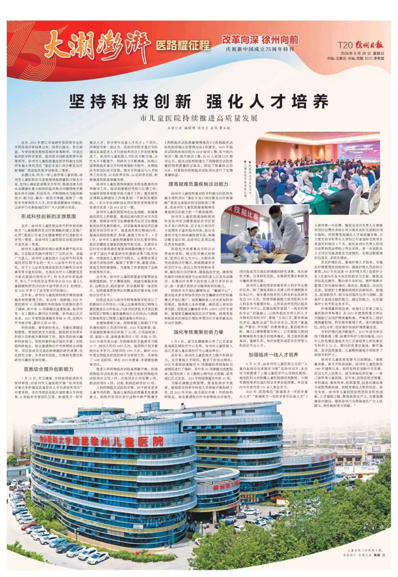 长期以来,作为一家三级甲等儿童医院,徐州市儿童医院在为患者提供高质量医疗服务方面,坚持以满足患者需求为导向,围绕危害人民生命健康的重大疾病的临床难点问题持续开展临床技术创新,科技攻关,并积极转化为临床新技术、新方法,解决一批技术难题,培育了一批医学专家和技术人才,切实推进健康徐州建设,让徐州乃至淮海地区的广大人民群众受益。