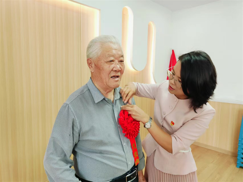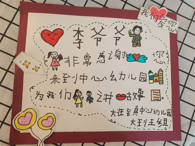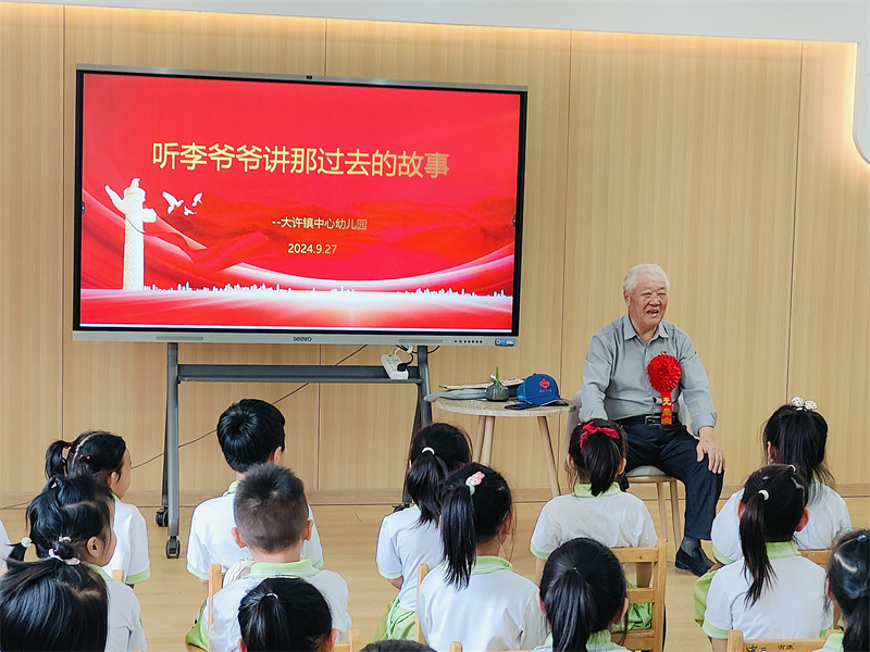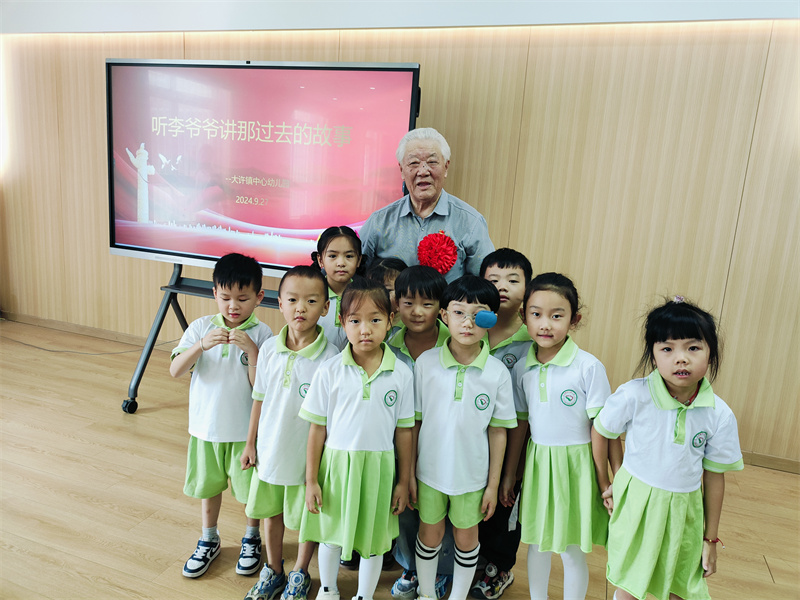 活动在大许镇小学中心校薛颖校长的帮助下,特别邀请了全国关心下一代先进工作者、江苏省优秀共产党员,省离退休干部先进工作者、徐州市普法达人、铜山区大许镇关工委主任李富义。沈雪桃园长首先热烈地向孩子和老师们介绍了李爷爷;其次,由史明影园长为李主任献上了代表光荣的红花,并为他戴在胸前;大班组的孩子们为李爷爷送上感谢卡。