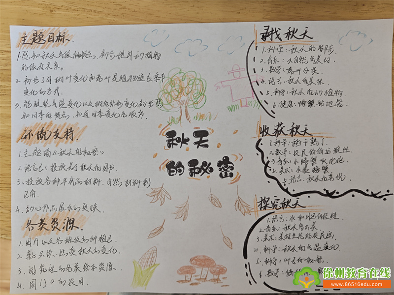 大班组:教师根据孩子们观察到的大自然变化,从欣赏文学作品和阅读科普图书中,了解不同的动物在秋季的生活方式以及人们是如何收获的,设定主题“秋天的秘密”。通过活动帮助幼儿更好地感知秋天的天气特点、秋天动植物的变化,理解秋天是丰收的季节,体验丰收的喜悦。