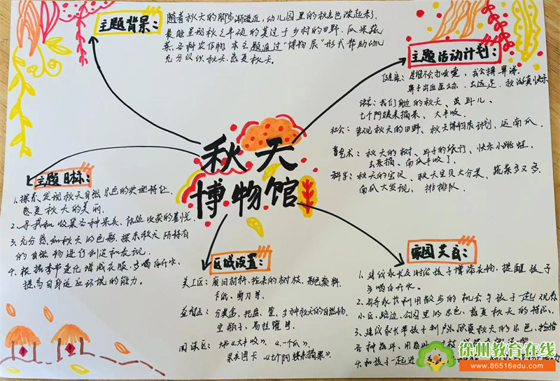 中班组:秋天是丰收的季节,最能呈现秋之丰硕的莫过于乡村的田野、瓜果蔬菜、各种农作物……这一切都能让孩子们感受到收获的喜悦;同时也极大丰富了孩子们在秋天里的感受和体验,让他们可以有更大的空间与机会去探索与发现秋天丰富的宝藏。中班组教师计划通过“博物展”形式帮助幼儿充分地认识秋天,感受秋天,并在自主创作和表现表达的过程中,充分发挥想象力和创造性。