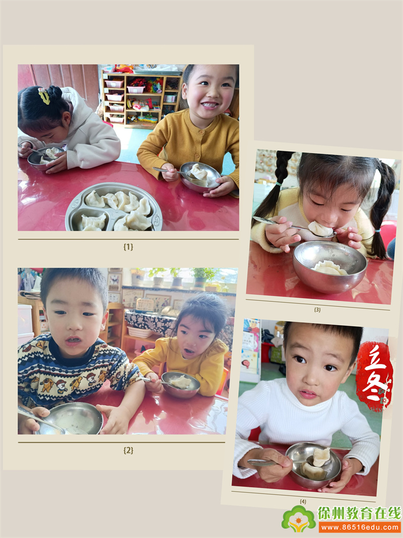俗话说“立冬不端饺子碗,冻掉耳朵没人管”。于是,孩子们在老师的指导下,亲手包制了各种形状的饺子。每一个饺子都充满了孩子们的创意和体验习俗的快乐。看!孩子们正在品尝热气腾腾的饺子,和家人一起补冬啦!