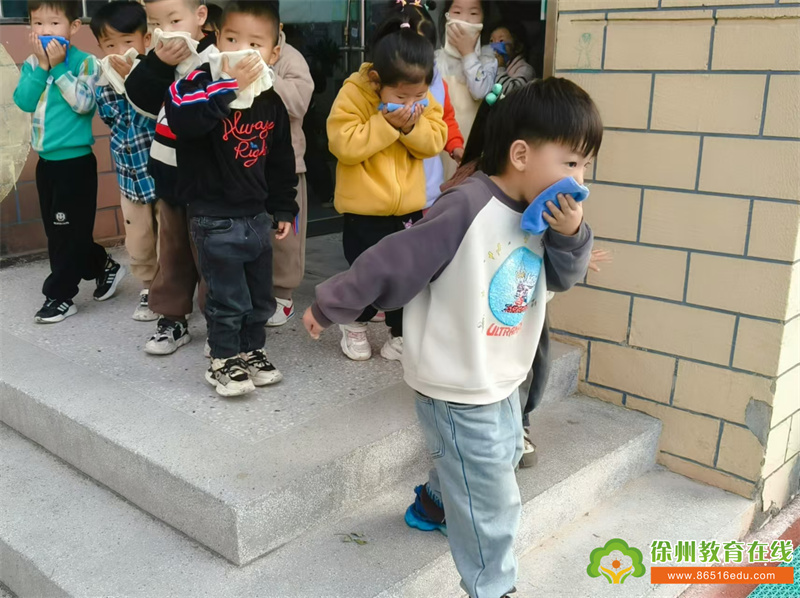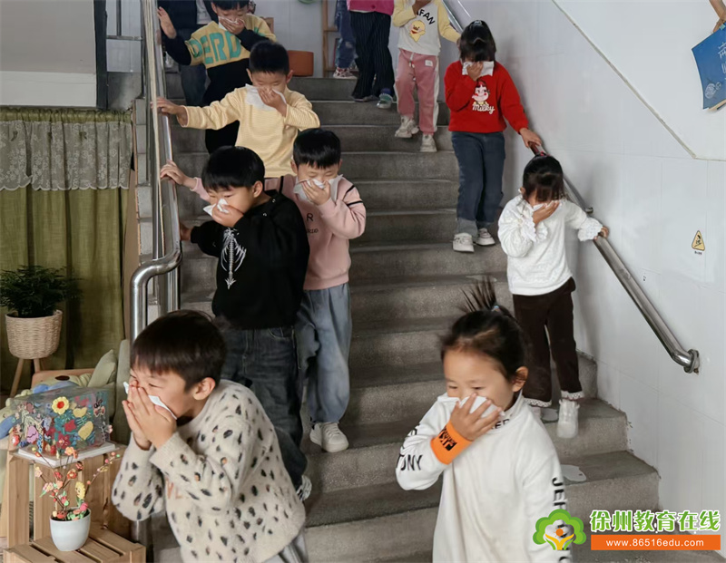各班教师迅速按消防预案的疏散线路有序带领幼儿拿起湿毛巾,捂住口鼻,小步快走,分两道楼梯迅速且有序下楼。