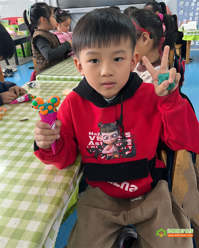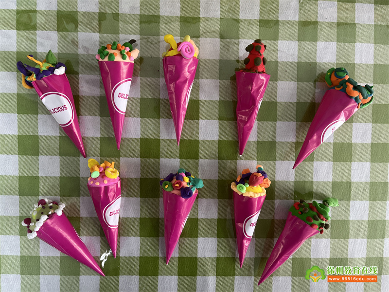 有的孩子将白色橡皮泥揉成圆锥状,作为冰淇淋的蛋筒,再用粉色、蓝色等彩色橡皮泥捏出一个个小巧玲珑的冰淇淋球,小心翼翼地放在蛋筒上,那模样就像是真正的冰淇淋在阳光下闪耀着诱人的光彩;有的孩子则发挥想象力,用橡皮泥捏出了各种奇特形状的冰淇淋,有带花纹的、有装饰着水果的,创意十足;还有的孩子互相合作,一起制作一个大大的冰淇淋蛋糕,大家你一言我一语地讨论着该如何搭配颜色和形状,氛围十分融洽。