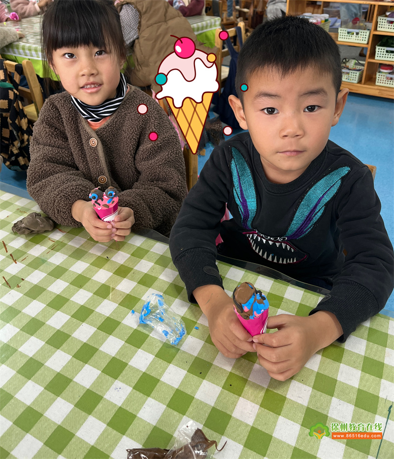 老师们温柔地向孩子们讲解了制作冰淇淋的步骤和要点,孩子们听得格外认真,小脑袋不时地点着。随后,孩子们便迫不及待地拿起橡皮泥,开始了他们的创作之旅。