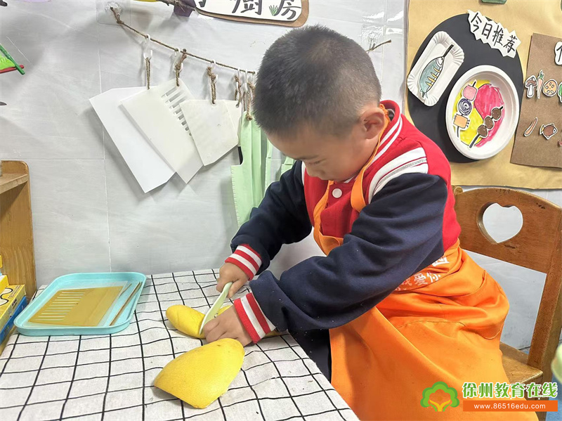 “小厨师们”在“厨房”忙碌地工作着。厨师羽阳把玉米皮仔细地剪成小段,放入“锅”中当作“玉米段面条”,又将用柚子皮切成一小块一小块。厨师耿煜祺专注地搅拌着锅里的“食材”,嘴里还念念有词:“我要煮出世界上最好吃的火锅!”