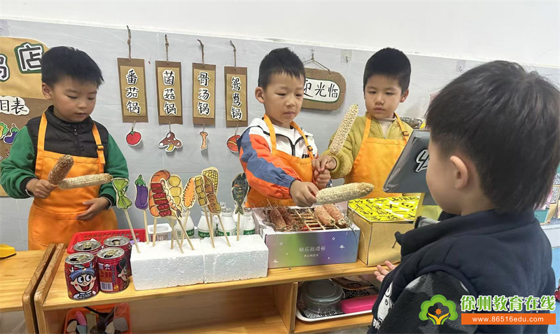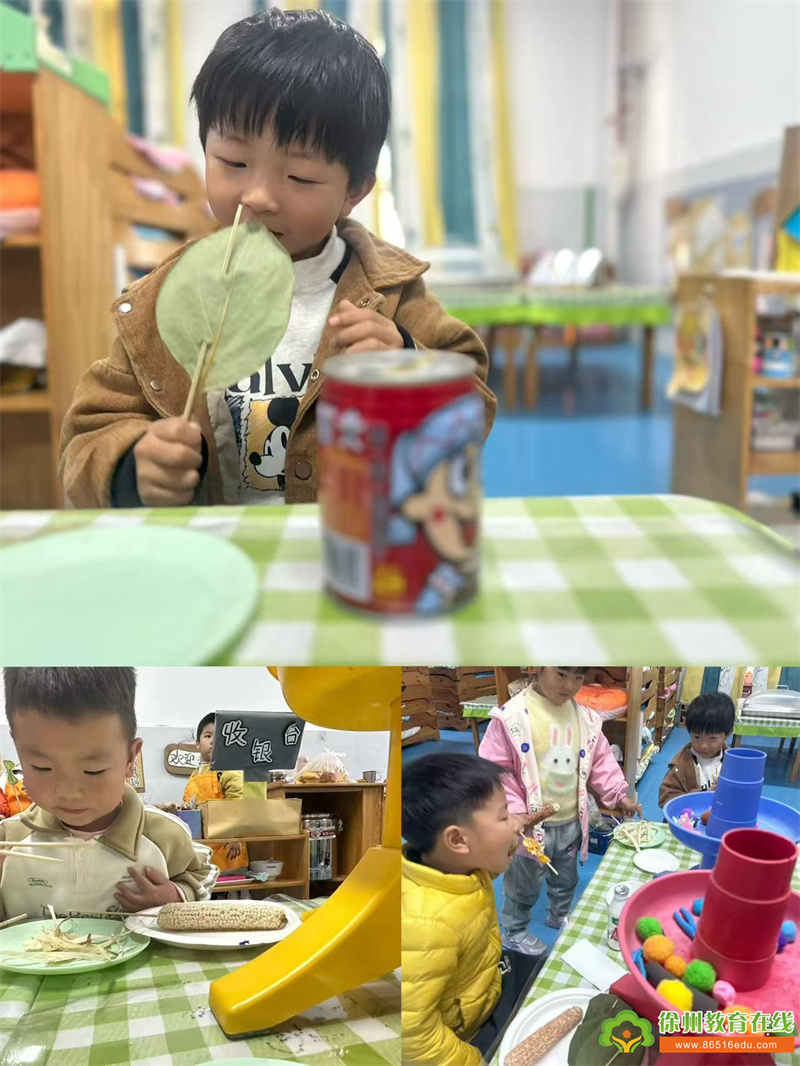 活动一开始,孩子们就兴奋地选定了自己的角色。扮演店员的陈俊延小朋友迅速进入状态,站在“柜台”后面,把用玉米棒制作的烤串拿在手里,清脆地叫卖:“又香又好吃的烤串,快来买呀!现做现卖还现烤”收银台旁的子豪也帮着叫卖着。叫卖声此起彼伏,充满了整个教室,努力吸引着“小顾客”们前来选购。