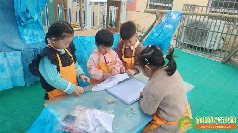 在老师的指导下,孩子们小心翼翼地折叠、捆绑白色棉布,随后轻轻地将调配好的染料滴落在布料上,或是将整个布料浸入染液中。每一滴色彩都如同魔法,让孩子们眼中闪烁着惊喜与期待。