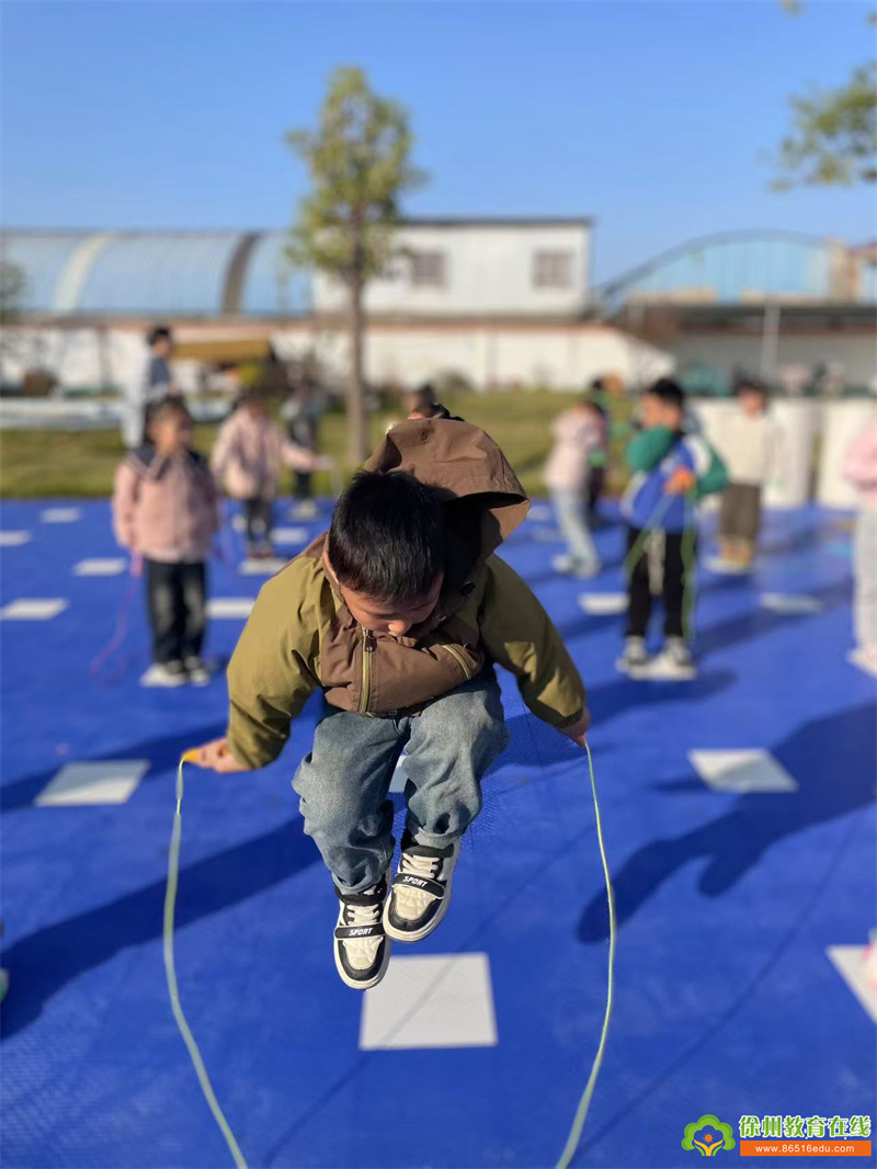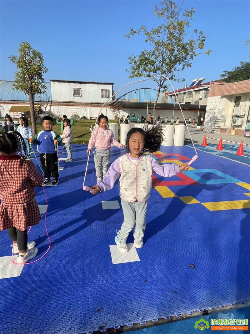 课间活动时间,操场上一片欢腾。跳绳比赛正在激烈地进行,别看大班的小朋友们小,他们跳起来可有模有样。有的小朋友轻盈地跳动。