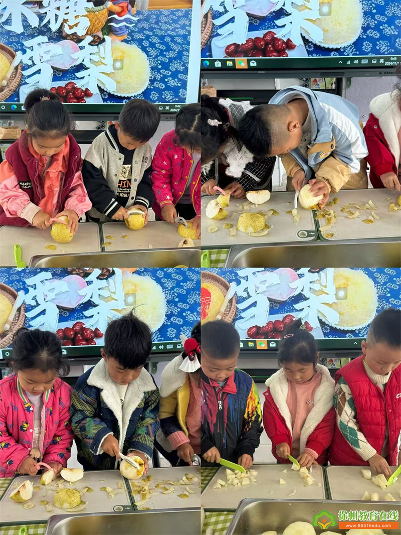 在活动开始之前,孩子们通过看一看,摸一摸,感知制作冰糖雪梨的食材和制作步骤,以及如何注意用刀安全,为后面的操作做好铺垫。在制作冰糖雪梨之前,孩子们把梨、枸杞、红枣洗得干干净净。