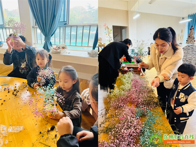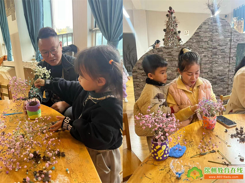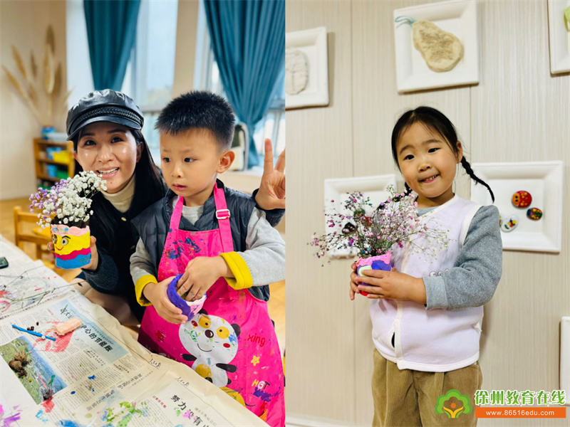 他们又用鲜花和自然材料装点花瓶,将秋天的美好瞬间定格在作品中。完成作品后,家长和孩子们开心地捧着花瓶拍照,留下了这难忘的一天。