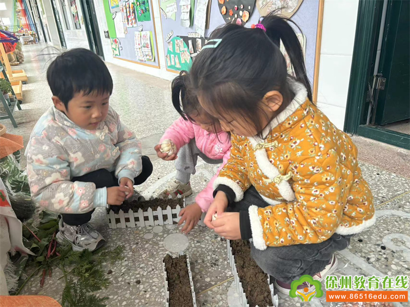 活动当天,阳光明媚,微风不燥,正是种植的好时节。在老师的带领下,孩子们首先进行了挖土种蒜的活动。他们拿起小铲子,挖了满满的泥土放进花盆里,然后带回教室,小心翼翼地将蒜瓣放入土壤中,再用土轻轻覆盖。每个步骤,孩子们都做得非常认真,生怕一不小心就弄伤了蒜瓣。种完蒜后,孩子们还为自己的蒜苗浇上了水,期待它们能够快快长大。