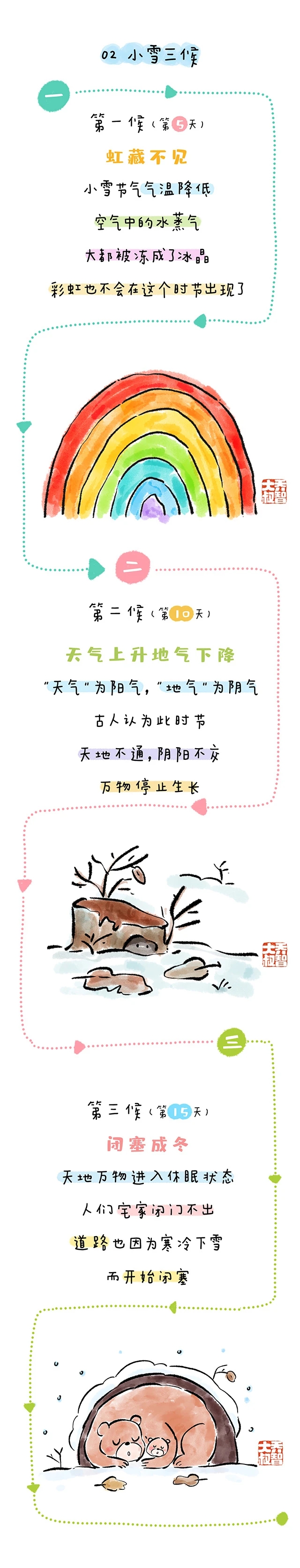 ?小雪三候分别是:一候虹藏不见,二候天气上升地气下降,三候闭塞成冬?。?