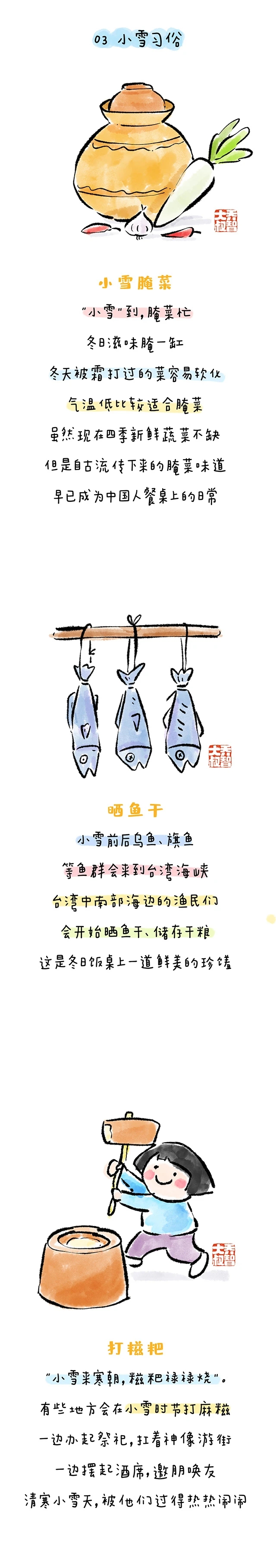?小雪节气的主要习俗包括腌制腊肉、品尝糍粑和晒鱼干。?