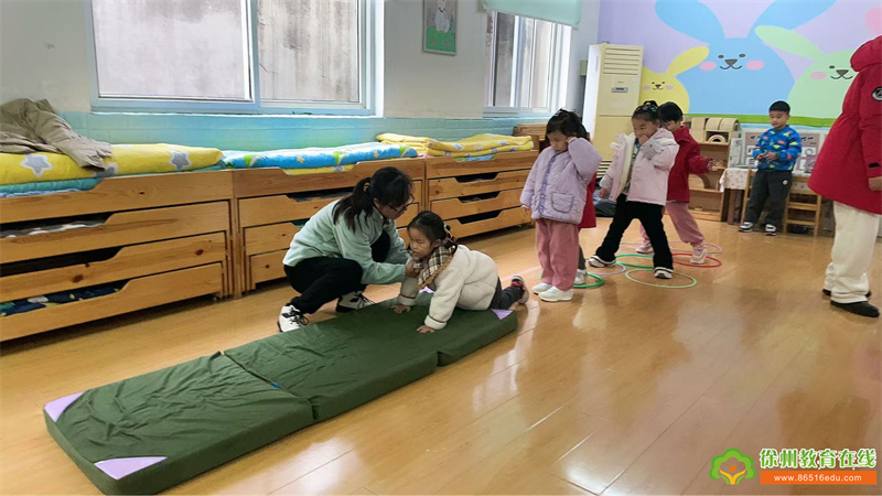 小班老师们根据幼儿的年龄特点,充分利用了现有场地及材料,兼顾走、跑、跳、钻、爬等运动技能,开发出了各种适合小班幼儿的锻炼模式及玩法。如:小勇士闯关、有趣的滑梯、小马过河等等,让孩子们在雨天、恶劣天气情况下也能在室内得到充分的锻炼。